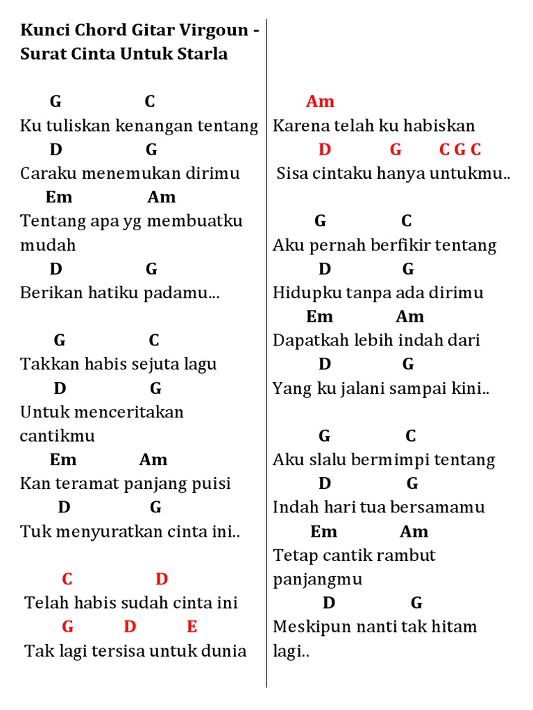 Virgoun Surat Cinta Untuk Starla Intro C D G Em C D G G7 C D G Em C D G G C Ku tuliskan kenangan tentang D G Caraku menemukan dirimu Em Am tentang apa yang membuatku mudah D G Berikan. Kunci awalan dari kunci G. Tab Chords Easy Chord Lyrics.